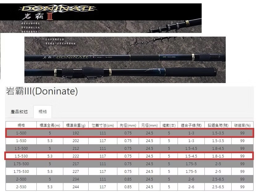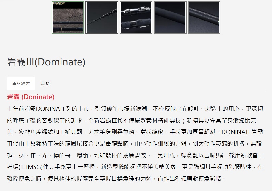 全新岩霸Ⅲ代不僅嚴選素材精研專技;新模具更令其竿身漸縮比完美,複雜角度纏繞加工補其韌,力求竿身剛柔並濟、質感綿密、手感更加厚實輕艇。DONINATE岩霸Ⅲ代由上興獨特工法的龍鳳尾接合更是畫龍點晴,由小動作細膩的弄餌,到大動作豪邁的拼搏,無論握、送、作、弄、搏的每一環節,均能發揮的凌厲盡致、一氣呵成,暢意難以言喻!尾一採用新款富士導環(T-IMSG)使其手感更上一層樓,新造型機能握把不僅美輪美奐,更是強調其手握功能服貼性,在磯際搏魚之時,使其極佳的握感完全掌握目標魚種的力道,而作出準確應對搏魚戰略。